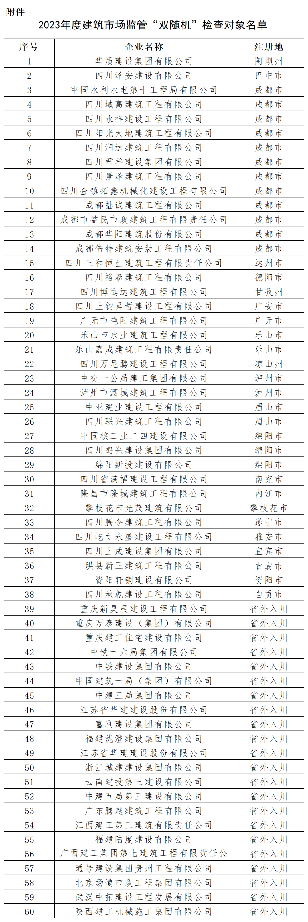 四川省住房和城鄉(xiāng)建設(shè)廳關(guān)于公布2023年度建筑市場(chǎng)監(jiān)管“雙隨機(jī)”檢查對(duì)象名單的通知