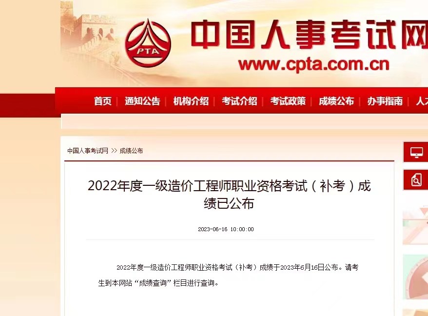 2022年度一級(jí)造價(jià)工程師職業(yè)資格考試(補(bǔ)考)成績(jī)于2023年6月16日公布。請(qǐng)考生到中國(guó)人事考試網(wǎng)站(http://www.cpta.com.cn/)點(diǎn)擊“成績(jī)查詢”欄目進(jìn)行查詢。
