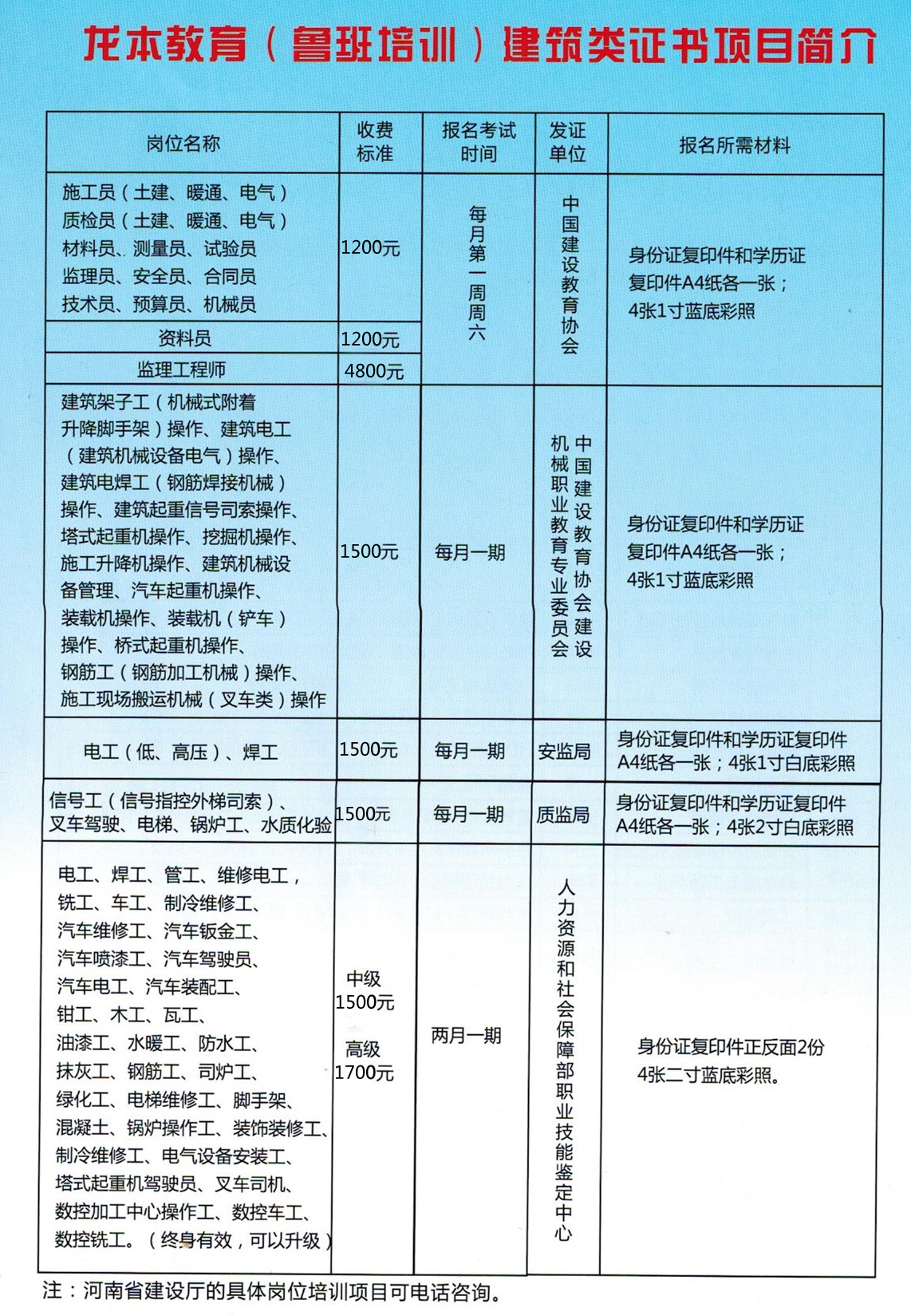 魯班培訓(xùn)河南分校主營:一級(jí)建造師培訓(xùn)、二級(jí)建造師培訓(xùn);BIM培訓(xùn);消防工程師培訓(xùn);造價(jià)工程師;監(jiān)理工程師;安全工程師等建筑人才及企業(yè)人才培訓(xùn);建筑學(xué)歷(鄭州大學(xué)、電大等);證書代注冊(cè);技工證;八大員;中級(jí)職稱代評(píng)等。